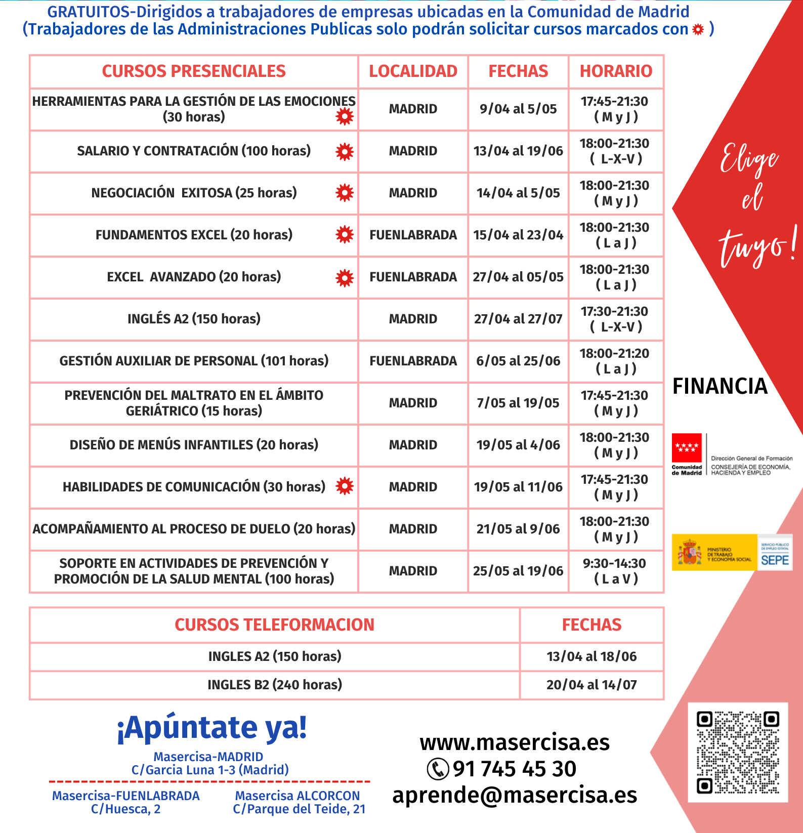 Escuela para el empleo. Formación continua. Más de 25 años de experiencia. Ofrecemos cursos gratuitos, tanto en Aula virtual como en nuestros centros de formación, a trabajadores/as, autónomos/as y desempleados/as. Estamos en Madrid. Cursos financiado por la Consejería de Economía, Empleo y Hacienda y el SEPE.